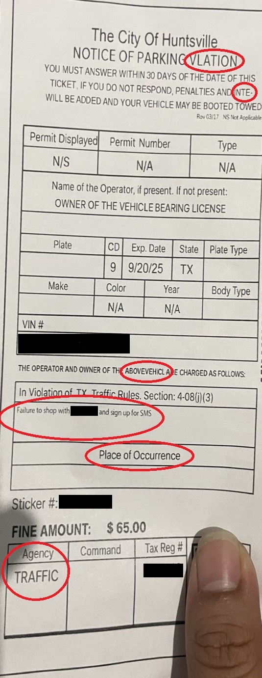 A resident of Huntsville found this fake parking citation on their vehicle. Their thumb is covering up a QR Code. If you find a suspicious citation, DO NOT scan the QR code, as it could potentially be a way to gain access to your personal information. There are several things that make this ticket an obvious fake.