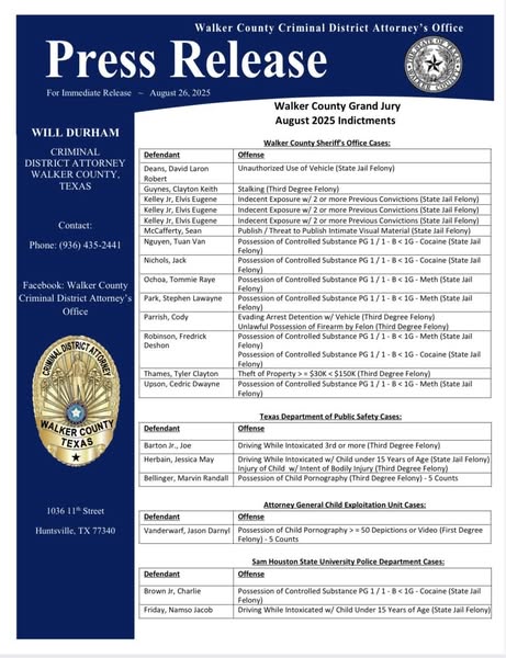May 2025 Grand Jury Results: Among the indictments returned was a Murder charge against Deonte Walker from March 7, 2025, for which Huntsville Police Detective Marlen Jennings led the investigation. Walker faces 5-99/Life for this First-Degree Felony.