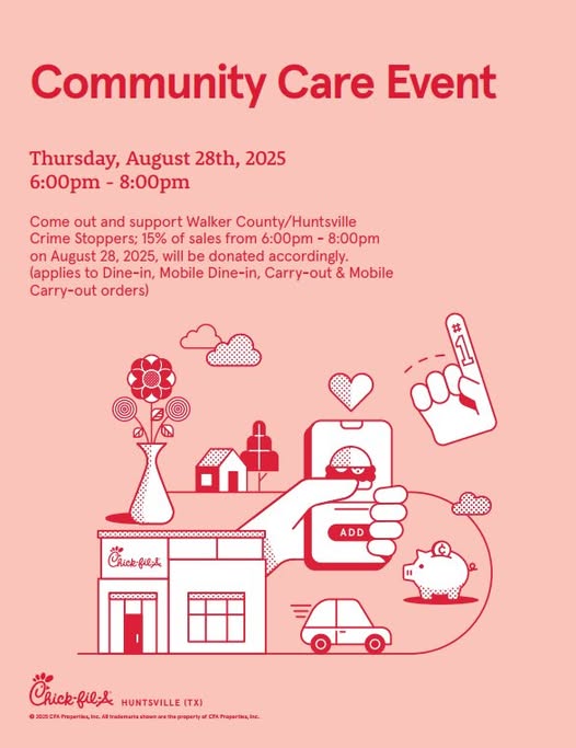 Join us for dinner and support a great cause! Chick-fil-A of Huntsville is hosting an event on August 28th from 6 PM to 8 PM, with a portion of all proceeds benefiting Walker County/Huntsville Crime Stoppers. Your participation directly helps Crime Stoppers in their efforts to keep our community safe. We hope to see you there!