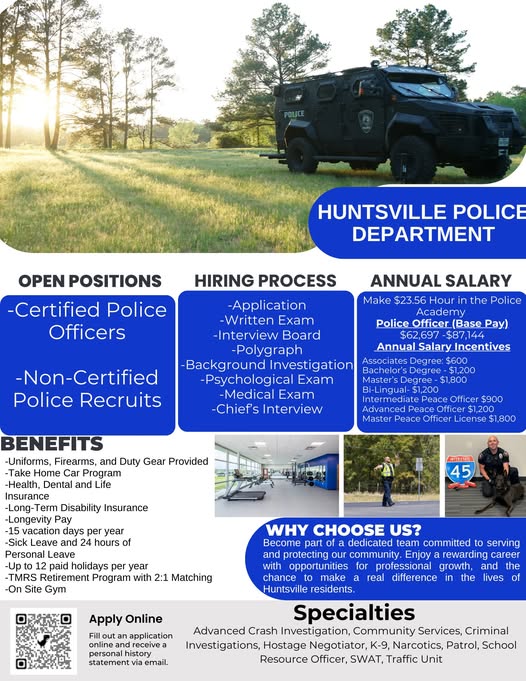 The Huntsville Police Department is actively seeking dedicated individuals to join our ranks as Police Officers or Police Recruits!